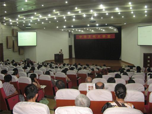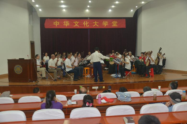 講學活動的下半場是學期末文藝匯演,由中華文化大學藝術團與中科大金秋藝術團聯袂演出。其中有宋振玉、趙特秀、劉軍等領唱領舞的“采茶舞曲”;有陳殿霞、胡元麗、朱啟芬、祖秀蘭等表演的健身舞和“紫竹聆風”以及李德華、晏渝、馬云、楊青等表演的旗袍秀“科大故事多”等,精彩紛呈。接著中和書院的孩子們和家長表演的快板“經典律動”也深受大家歡迎,孩子們繪聲繪色的誦讀、純真的話語,讓我們欣喜看到中華文化的薪火相傳,后繼有人。最后在陳海昌先生指揮下,中華文化大學民樂團和中國科大金秋民樂團聯袂演奏的一組民樂合奏把活動推向高潮,水上報告廳里掌聲經久不息。