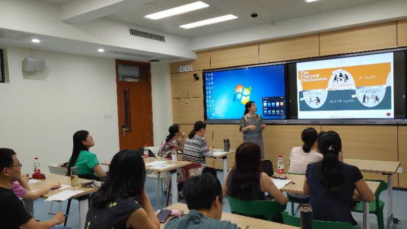 第六場“科技在語言教學中的應用”講座主要展示翻轉課堂的教學模式與傳統課堂的不同以及翻轉課堂的優越性。Tamara教授從分析傳統課堂的局限性如學生過度依賴老師、師生比例、有限的課本知識等出發,提出“PANDA”翻轉課堂課程教學模式并結合時間安排與學生的調研反饋探討翻轉課堂在大學英語教學中的運用。