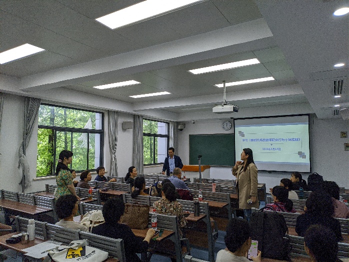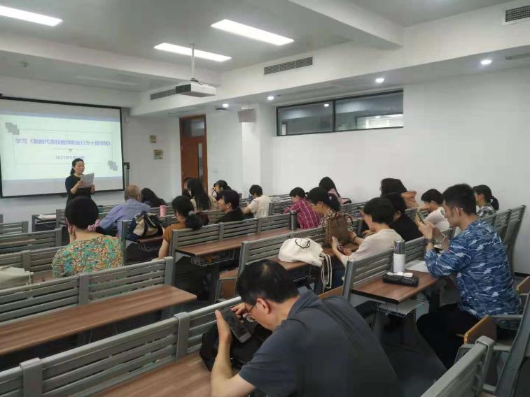 為進一步規范新時代高校教師職業規范,深化師德師風建設,按照學校黨委教師工作部和黨委組織部“關于加強師風師德建設學習與討論的通知”要求,研究生英語教工黨支部全體黨員、原研究生教研室教師(包含兩名退休返聘教員)及MTI中心教學秘書喬喬老師于5月8日晚聚會云端,大學英語教工黨支部全體黨員和部分非黨員教師于5月14日在二教2404教室組織開展《新時代高校教師職業行為十項準則》、《教育部關于高校教師師德失范行為處理的指導意見》和《關于進一步弘揚科學家精神加強作風和學風建設的意見》等文件精神的學習和討論活動,活動由總支書記斯駿老師、研究生英語教工黨支部書記邢鴻飛老師和大學英語教工黨支部副書記鄭捷老師主持。