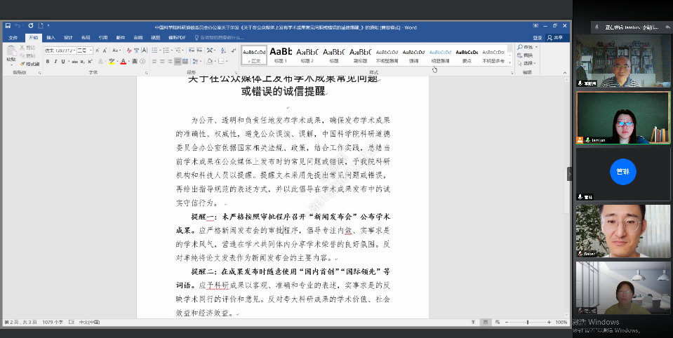 大學英語教工黨支部于6月11日通過網絡會議形式開展專題學習,會議由支部書記張曼君老師主持。首先,參會黨員按照學習計劃,集體完成《中國共產黨簡史》相關章節的學習。隨后,張老師帶領大家學習中國科學院科研道德委員會辦公室印發的《關于在公眾媒體上發布學術成果常見問題或錯誤的誠信提醒》文件,文件是根據國家相關法規、政策和科研不端舉報實例制定的,教師黨員表示其實用性和指導性很強。最后,與會黨員分享學習心得,張老師就社團指導老師等工作進行簡要說明,鼓勵老師們以不同形式參與、指導學生的課外活動,幫助學生全面發展。
