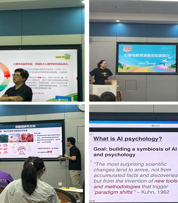 21日上午,三營舉辦了多場講座。心理學系何曉松特任研究員首先向在場的營員全面介紹了心理學系的發展歷程、現狀以及未來發展方向。何曉松老師表示,中國科大心理學系雖然新,但是研究源遠流長。在對心理學系進行總體介紹后,何曉松老師介紹了其腦網絡與功能實驗室,該實驗室主要研究方向包括神經系統疾病對大腦結構、功能網絡的影響,大腦結構、功能網絡組織特征在神經系統疾病診療中的應用等。心理學系特任研究員呂心游介紹了神經可塑性與腦調控實驗室,其團隊關注精神疾病(腦成癮為主)的神經可塑性機制與神經調控干預。與其他實驗室相比,呂心游老師的實驗室既有動物研究,也有人的研究。心理學系特任研究員王玨老師的研究生楊素節介紹了心理與教育測量實驗室,主要研究方向包括:研究教育和心理測評在K-12階段選拔天才學生中所發揮的作用、開發適用于中國教育系統下的教育評估的理論框架,為主觀測試開發集自適應學習、測試、評分為一體的計算機系統等。心理學系特任研究員林志成老師在線上帶來了題為“What is AI psychology?”的講座,林老師認為,其目標是構建人工智能與心理學的共生,人工智能的出現不僅僅是一場技術熱潮,對于心理學研究而言也是一場“范式轉換”。各位老師的精彩講座激發了在場營員的興趣,大家進行了熱烈討論與深入思考并積極向老師提問。